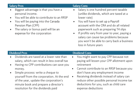 Many times, salary and bonuses are paid out to individuals to help ensure the corporation doesn’t earn over the Small Business Limit of $500,000 because a privately controlled Canadian Corporation (CCPC) pays lower income taxes if the income amount remains below $500,000. After salary and/or bonuses are paid, dividends can be used if more income is necessary.